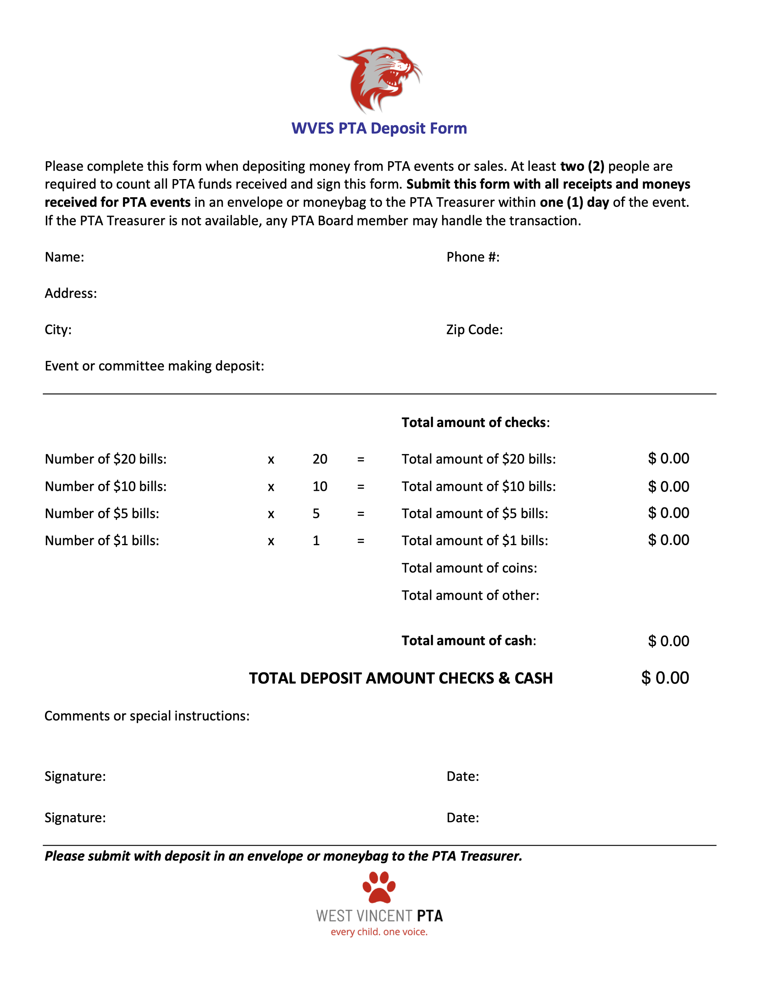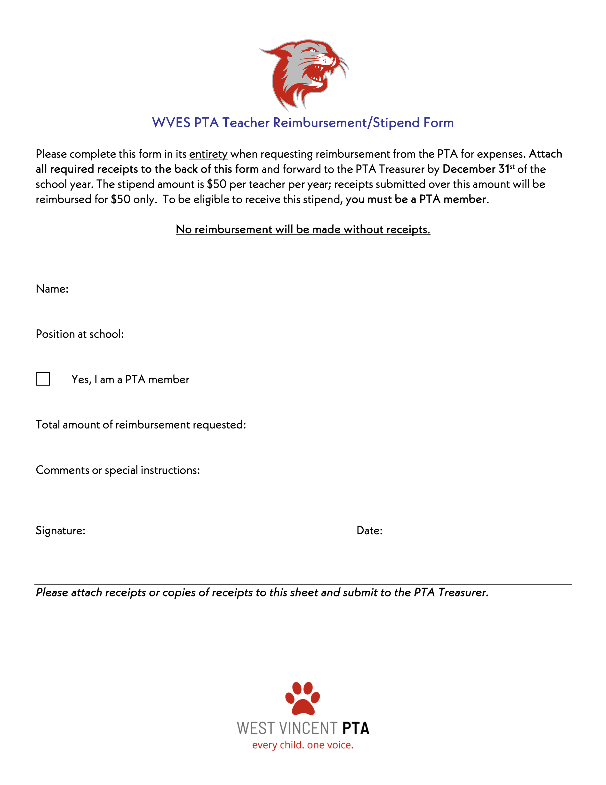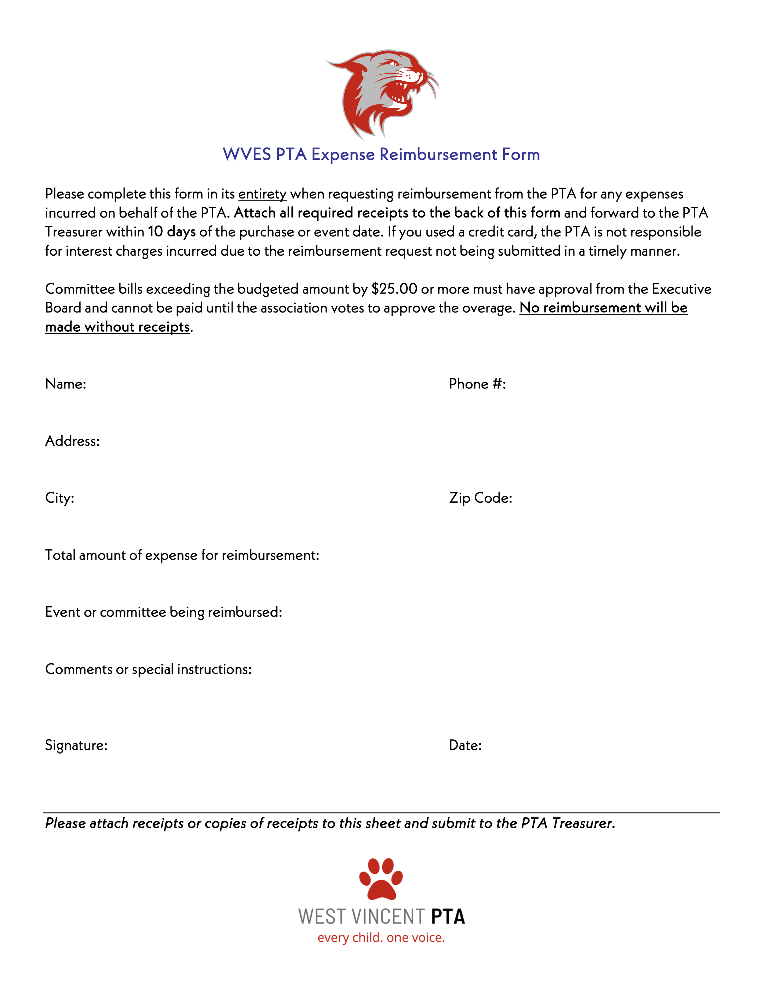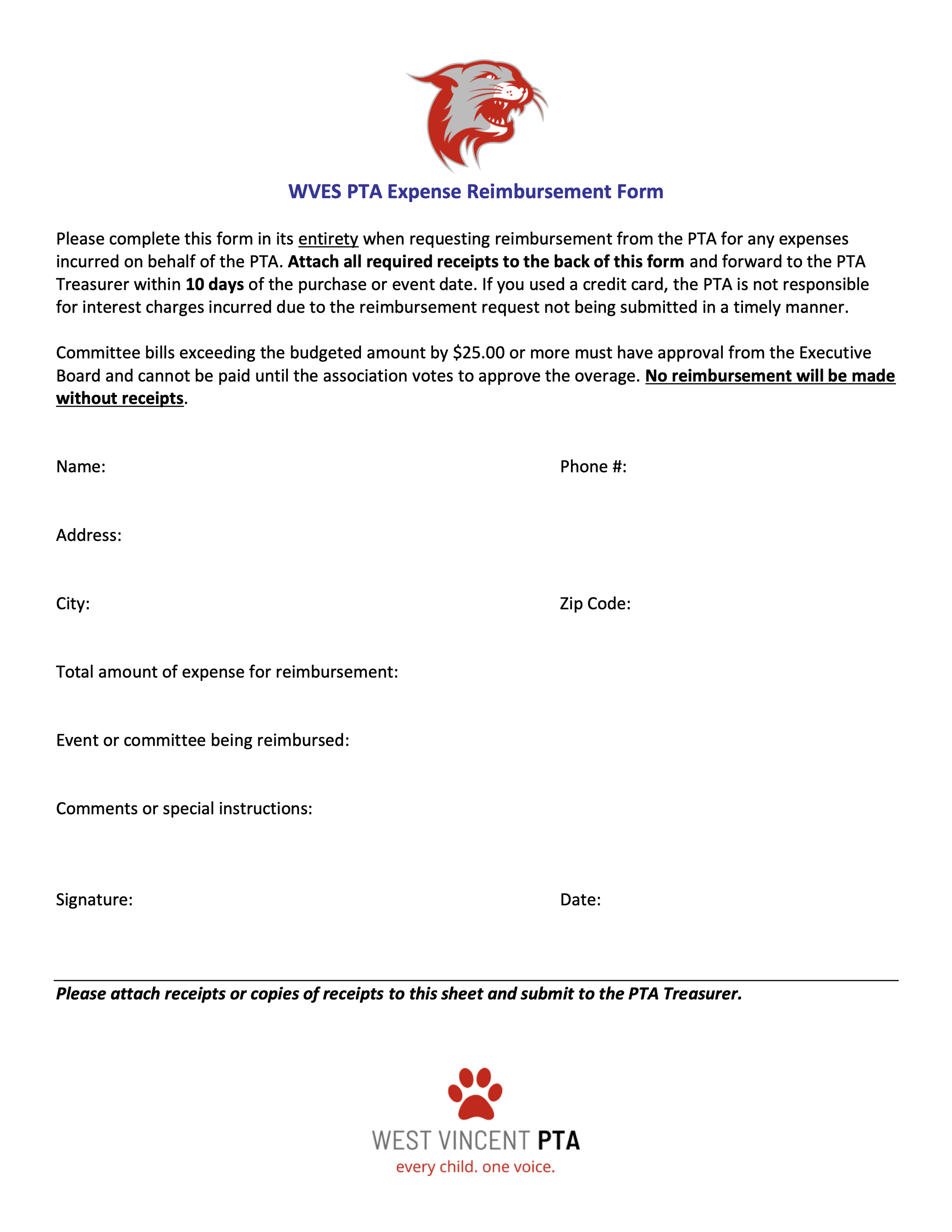Fill out this form to request reimbursement from the PTA for any expenses you’ve covered on our behalf. Be sure to complete all sections so we can process it quickly!