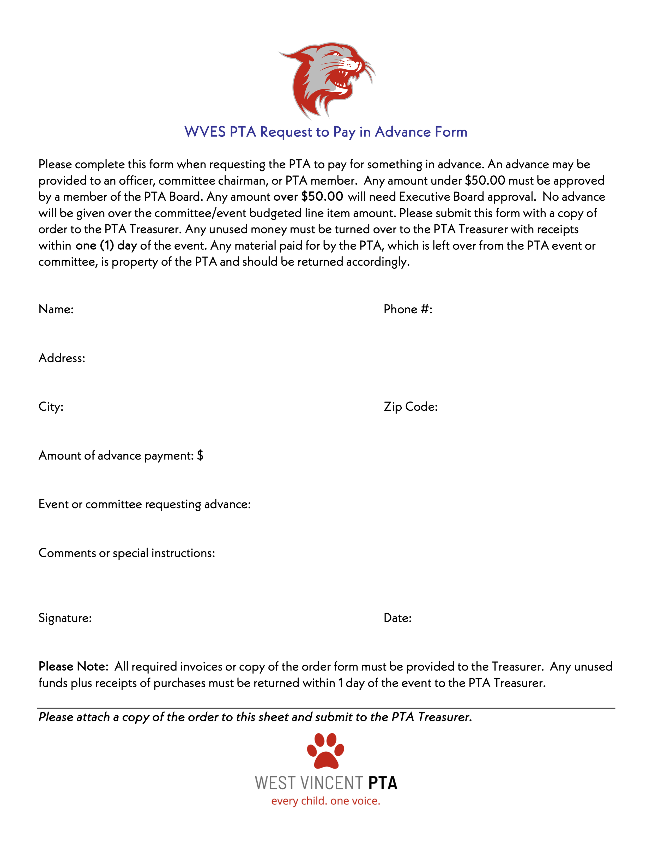 Need funds ahead of your event? Fill out this form and the PTA can cover approved expenses in advance.