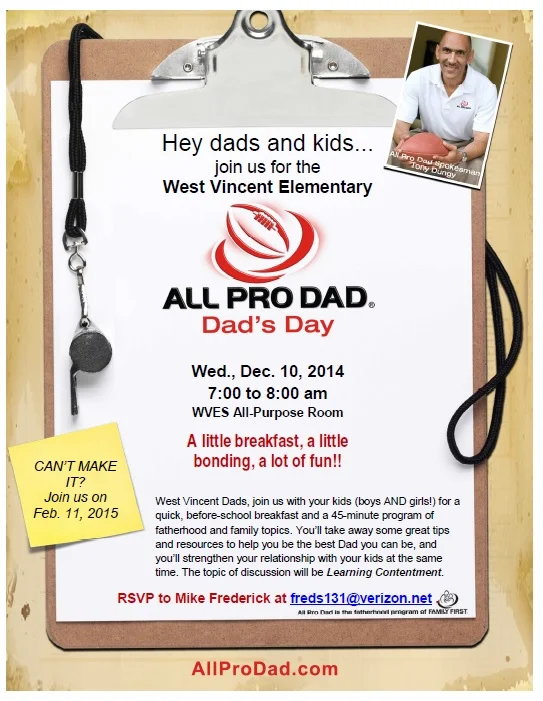 West Vincent Dads! Mark your calendars for the next All Pro Dad breakfast with your child(ren) on December 10, 2014, from 7:00-8:00 am in the West Vincent Elementary All-Purpose Room. The topic of discussion will be "Learning Contentment". Please rsvp to Mike Frederick at freds131@verizon.net if you will be able to attend.