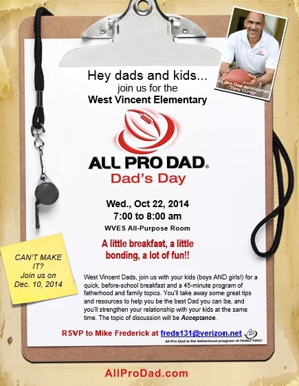 West Vincent Dads! Please plan to attend the first All Pro Dad breakfast of the year with your child(ren) on October 22, 2014, from 7:00-8:00 am in the West Vincent Elementary All-Purpose Room. The topic of discussion will be "Acceptance". Please rsvp to Mike Frederick at freds131@verizon.net if you will be able to attend.