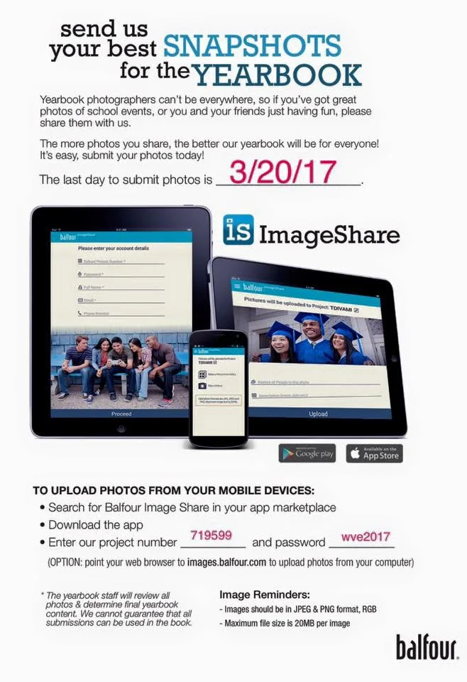 The yearbook committee is looking for photos from parents! There are many times when parents stop in to help at the school. If that happens and you can snap a picture or two, please consider submitting it for yearbook. To make it easier for you to do, our yearbook publisher, Balfour, has a mobile app. It will prompt you for your name and email address the first time (photos will be tagged with that info so that we can contact the photographer if we have any questions). If you take pictures on a camera, download then through their website on your computer. Use our special codes to access our account (user id: 719599 and pw: wve2017). If you have any questions, please contact Kristina Casey (discoturtle9@gmail.com) or Rita Pederson (ritaped@yahoo.com). Thank you in advance for your help and support.