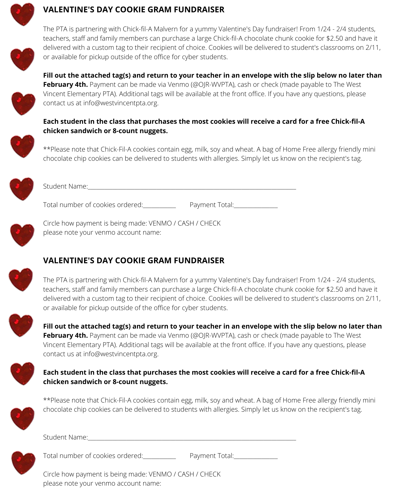 An information form and tags will be sent home in student's folders on 1/24 with more details. Simply fill out the tag(s) and return to your teacher no later than February 4th with your payment. Payment can be made via Venmo (@OJR-WVPTA), cash or check (made payable to The West Vincent Elementary PTA). Additional tags will be available at the front office. If you have any questions, please contact us at info@westvincentpta.org.
