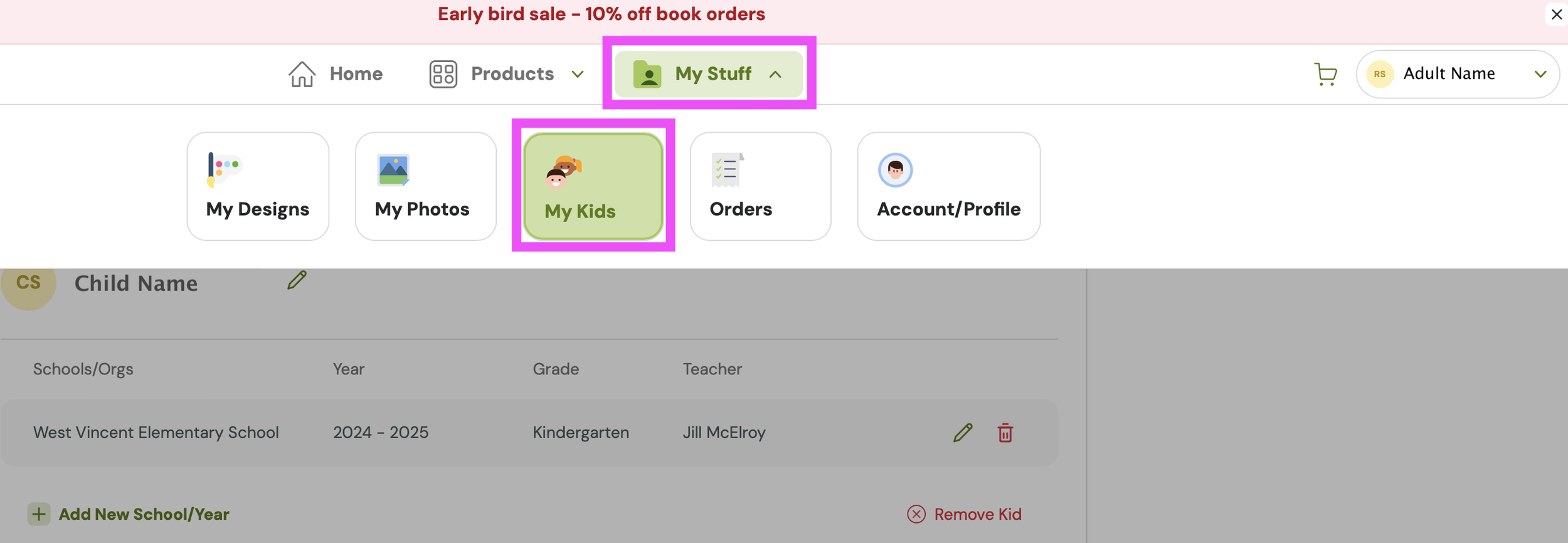 After logging in, select 'My Stuff' from the top menu bar and then select 'My Kids'